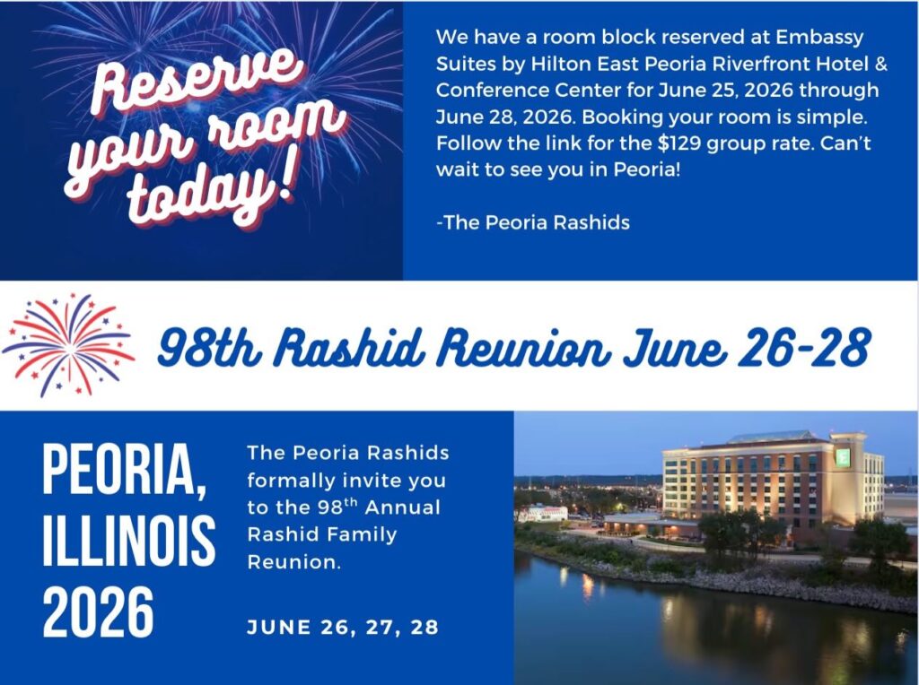 We are excited to invite the family to the 98th annual Rashid Family Reunion, held for the 13th time in Peoria, Illinois! We can’t wait to see you June 26-28th.